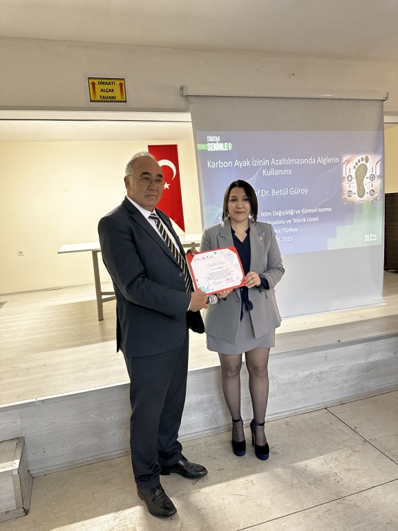 Söyleşide, çevresel sürdürülebilirlik açısından büyük önem taşıyan “Karbon Ayak İzinin Azaltılmasında Alglerin Kullanımı” konusu ele alındı. Prof. Dr. GÜROY; alglerin yenilenebilir enerji, biyofiltrasyon ve çevre temizliği gibi alanlardaki potansiyelini öğrencilerle paylaşarak, doğa dostu çözümler konusunda önemli bilgiler verdi.